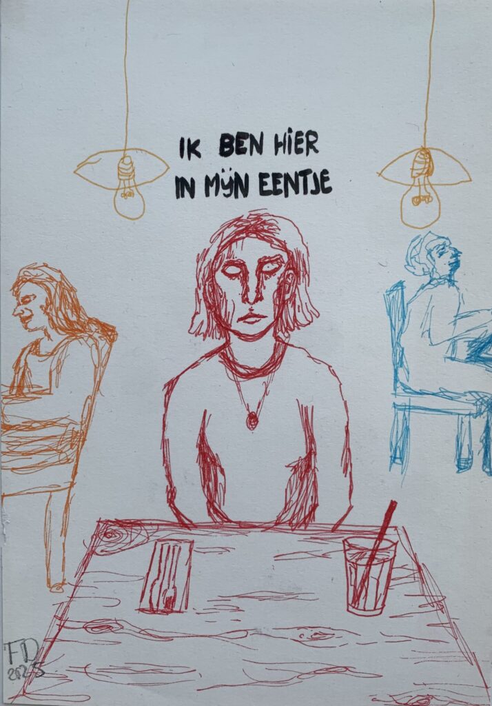 'Ik ben hier in mijn eentje' - 21 x 15 cm - 2025 - pen