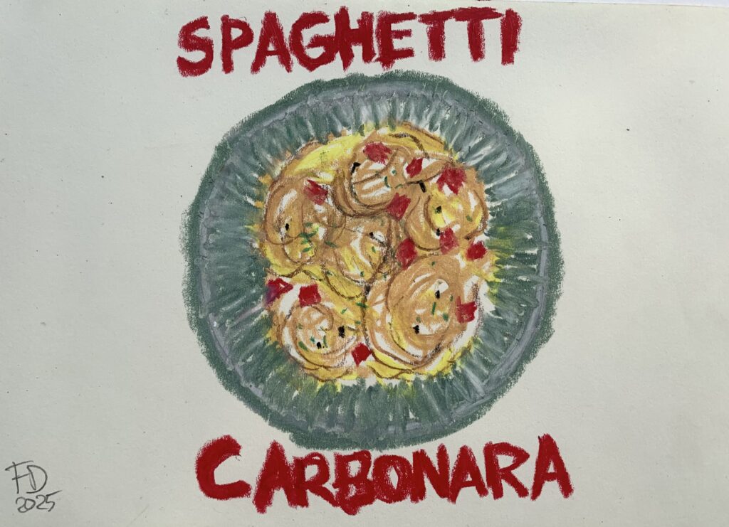 'Spaghetti carbonara' - 14 x 19,5 cm - 2025 - oliepastelkrijt
