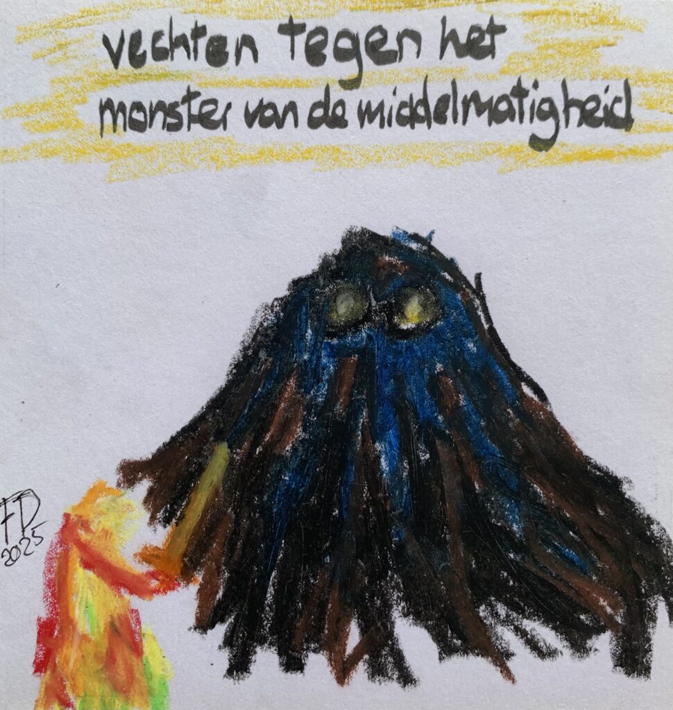 'Vechten tegen het monster van de middelmatigheid' - 11 x 10,5 cm - 2025 - oliepastelkrijt & stift